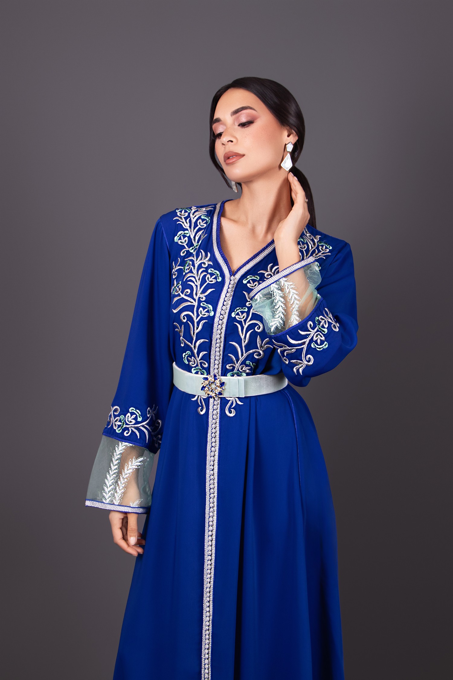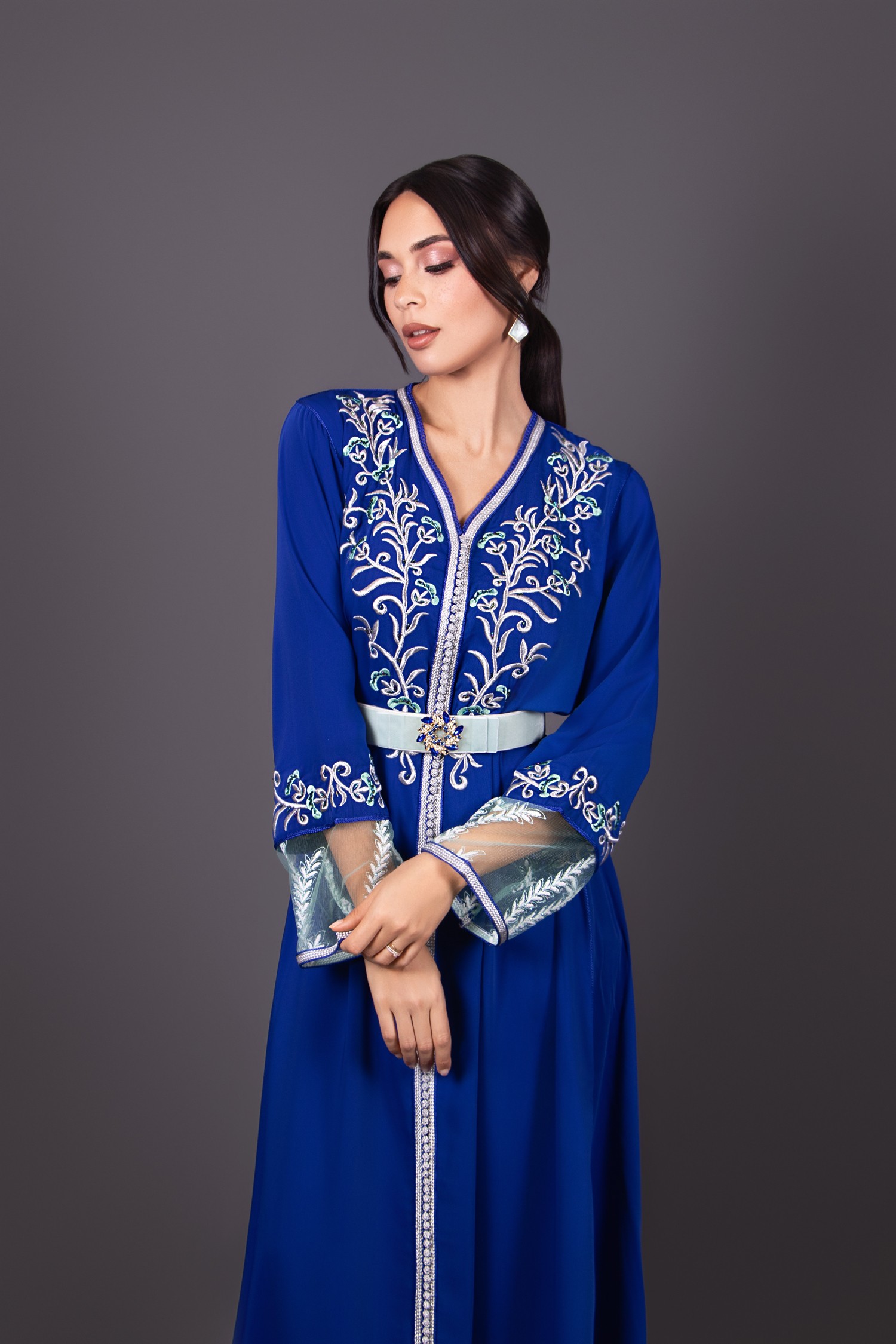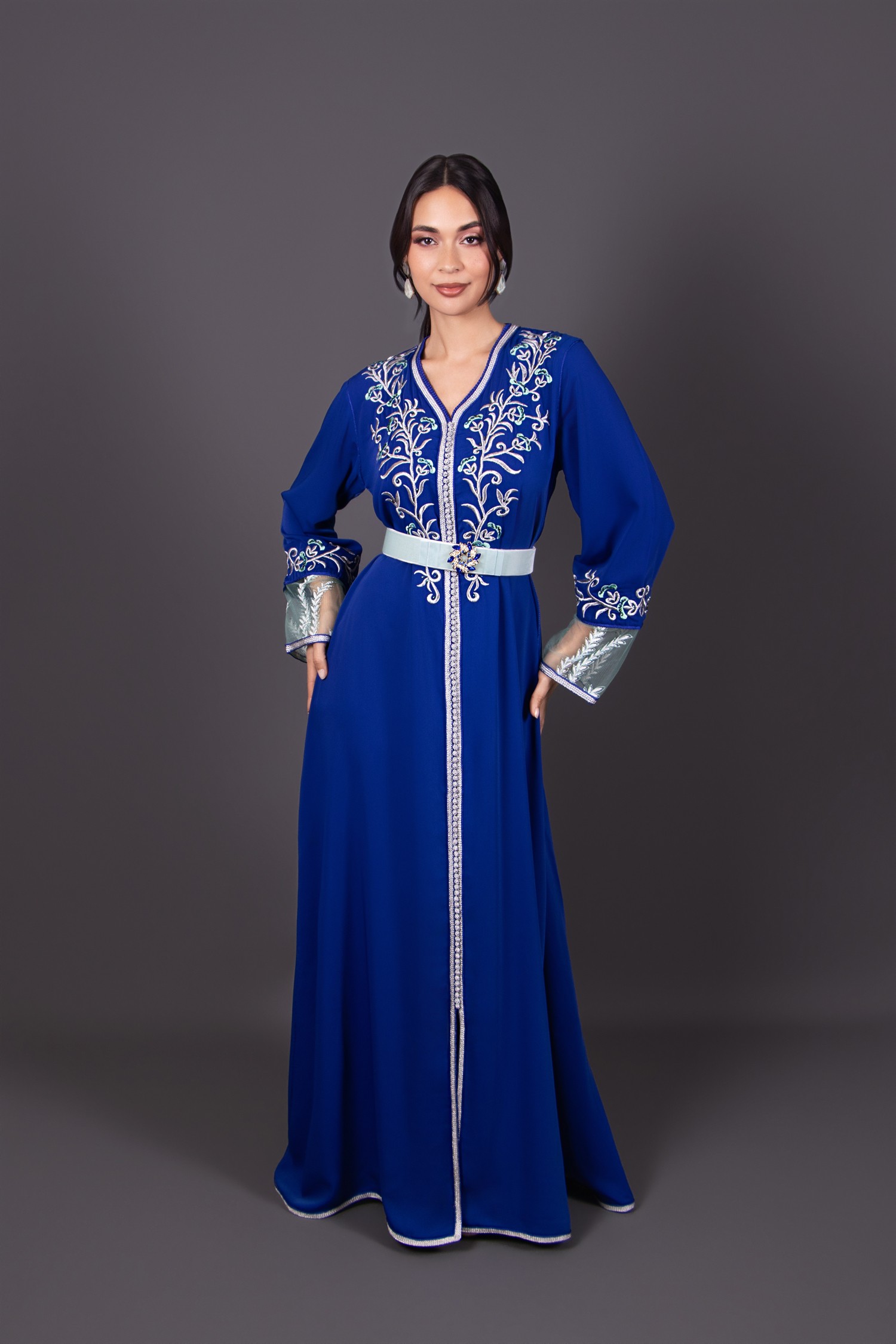 Este caftán de una sola pieza en azul real encarna una elegancia atemporal y un encanto irresistible. Su tono profundo y vibrante está realzado por delicados bordados plateados, especialmente en el escote en V y el busto, que añaden un toque de distinción.