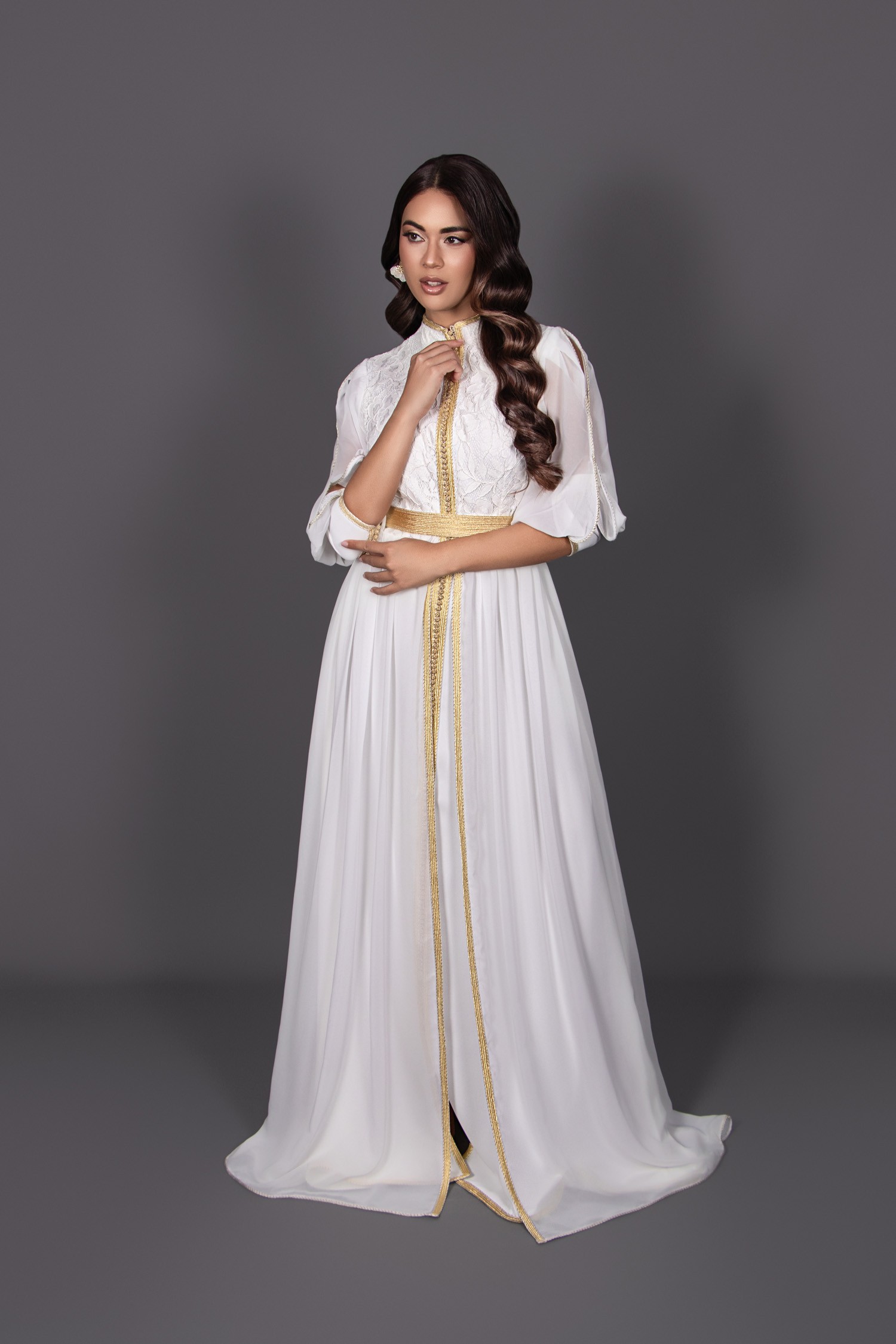 Déjate cautivar por la elegancia de este caftán blanco y dorado, confeccionado con materiales delicadamente sedosos. Su busto de encaje blanco, ajustado con precisión, luce un refinado cuello alto y unas mangas abiertas de diseño exclusivo.