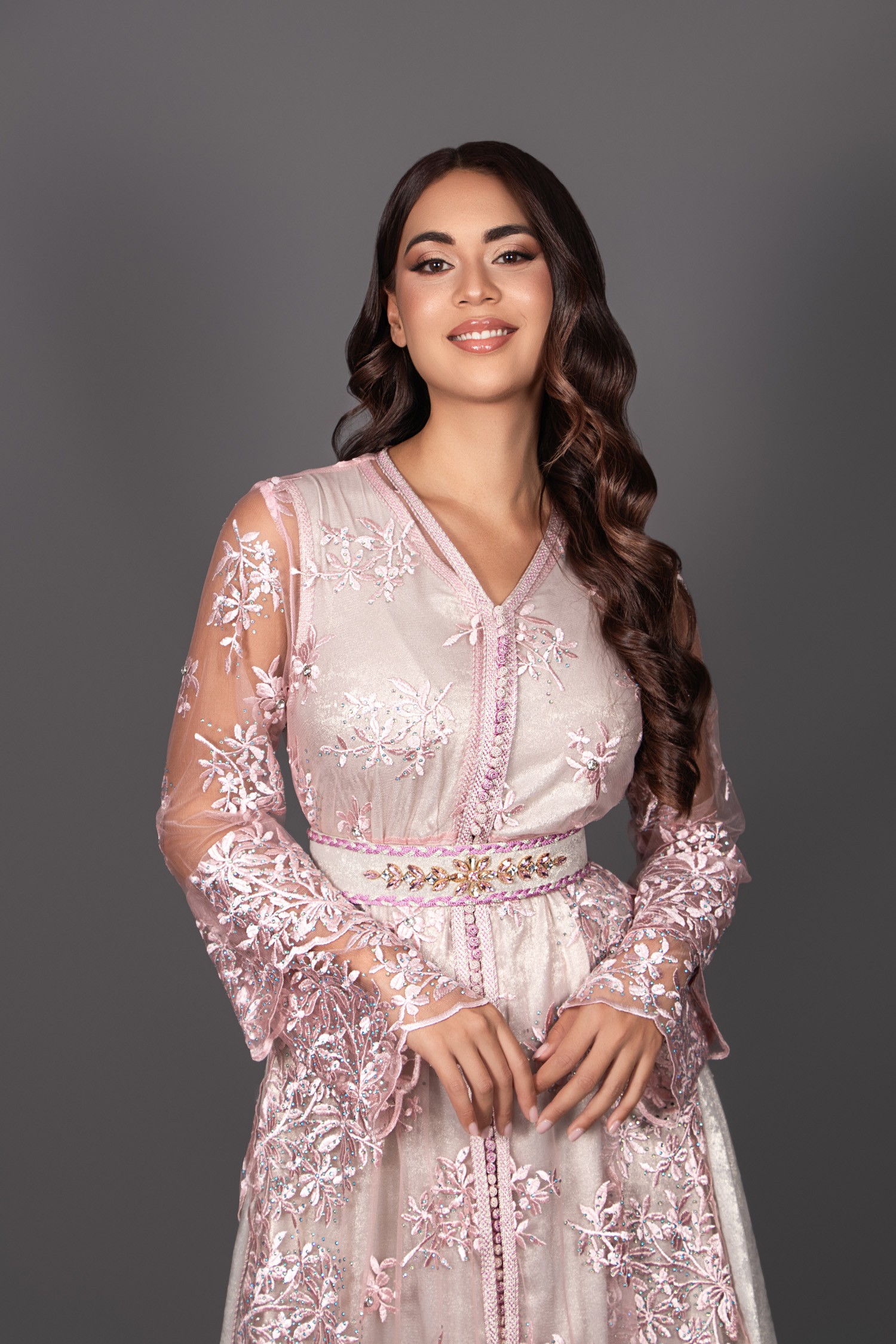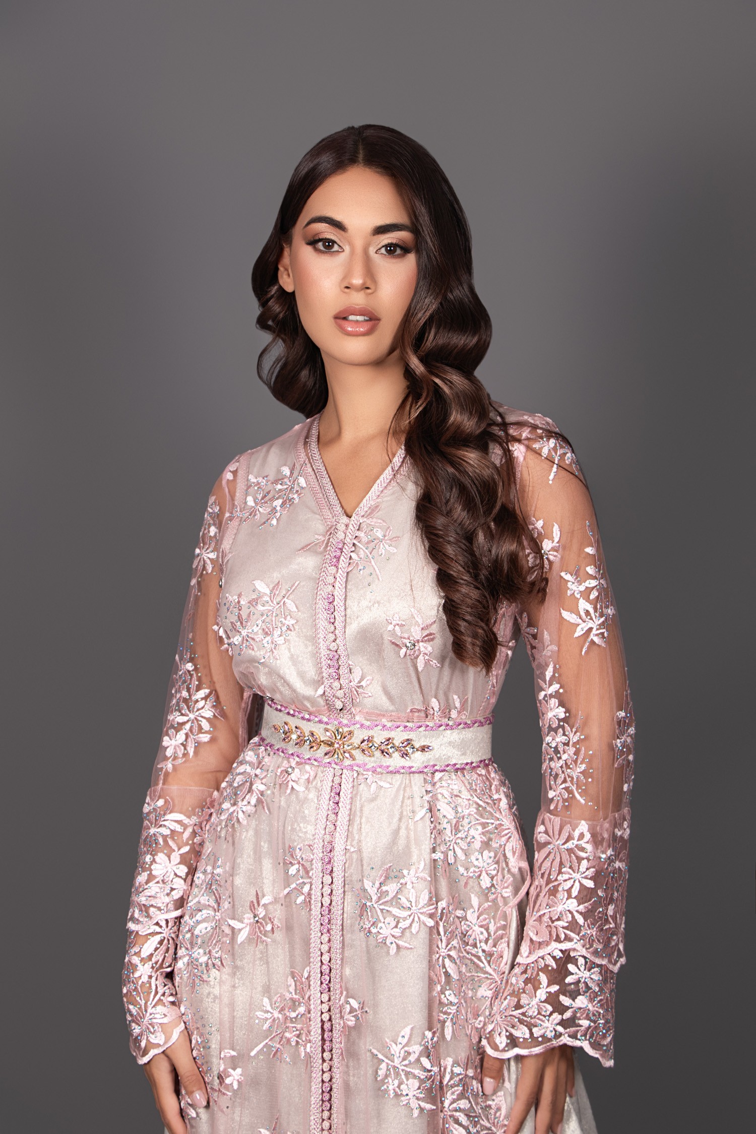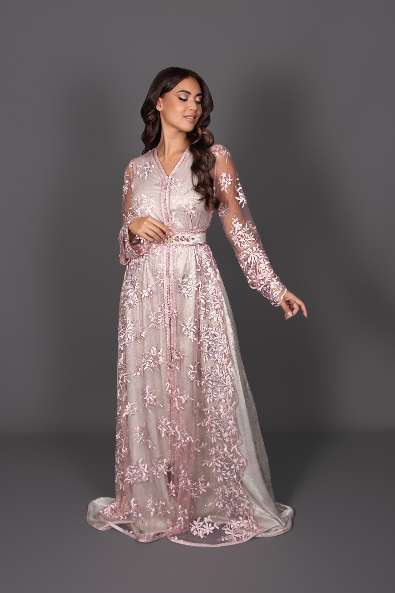 El caftán interior sin mangas en lamé plateado aporta un toque luminoso y sofisticado. El sobre-caftán, adornado con encaje rosa, crea un efecto de mangas dobles ligeramente acampanadas, aportando volumen y fluidez al conjunto. Una abertura lateral en la falda revela delicadamente el festón para un acabado aún más elegante.