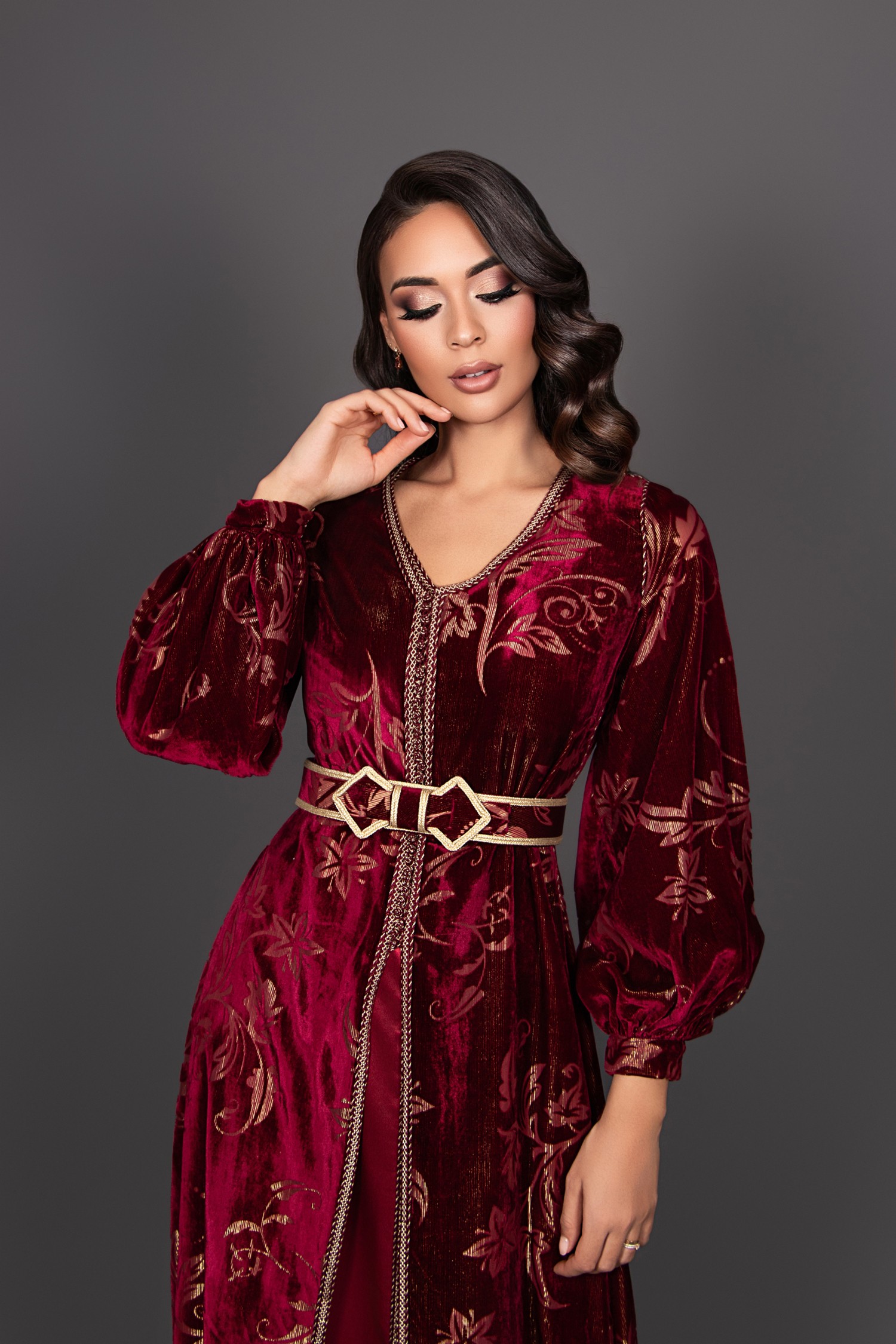 Este caftán de terciopelo burdeos es una pieza elegante y refinada, adornada con patrones florales incrustados con detalles dorados. Las mangas abullonadas aportan un toque romántico, mientras que el cinturón con su detalle dorado estructura la silueta.