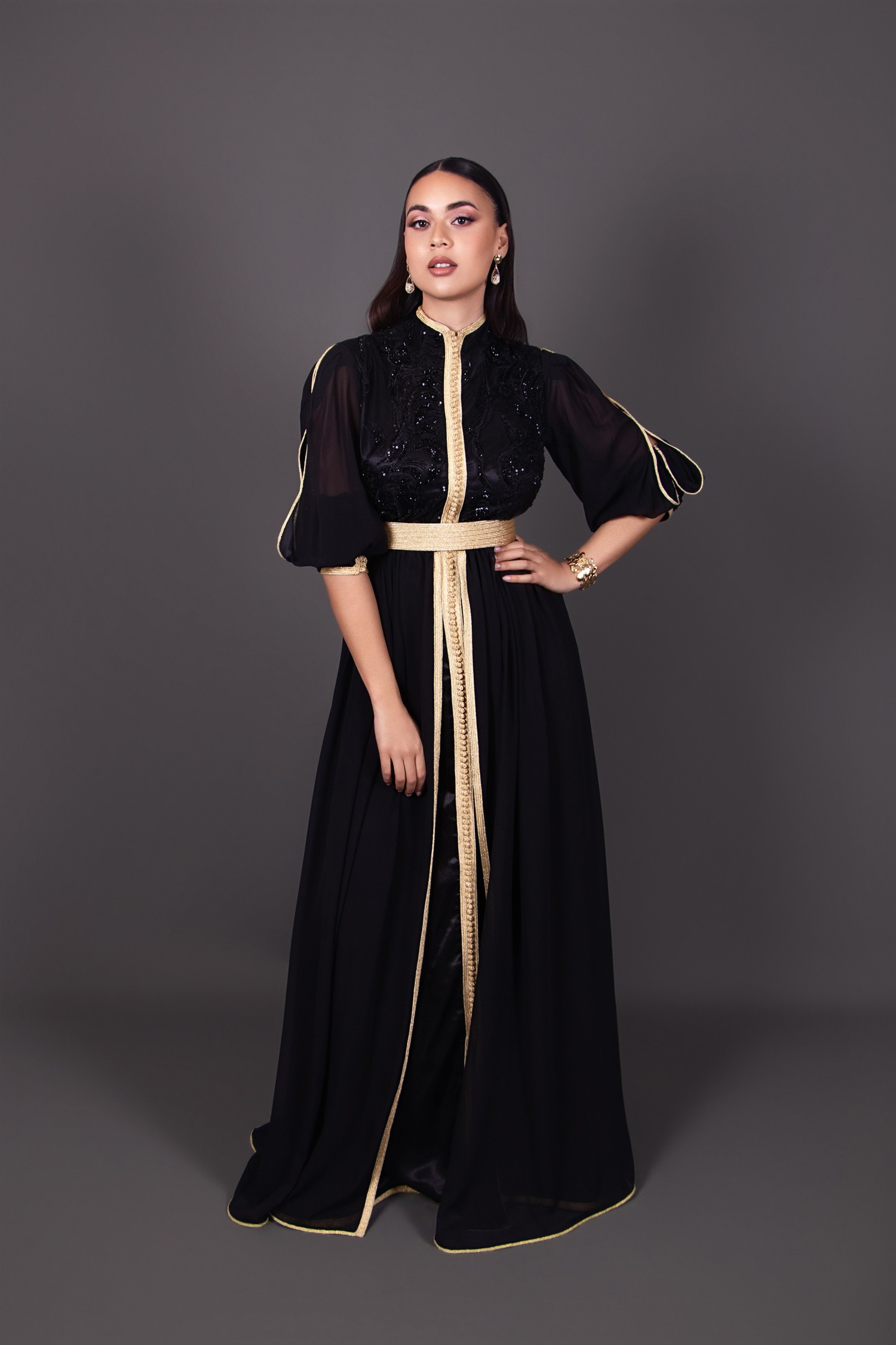 Les finitions en Sfifa dorée et les boutons assortis subliment l’ensemble avec une touche de sophistication. Quant à la ceinture dorée, elle souligne délicatement la taille et crée un contraste harmonieux pour une silhouette des plus élégantes.