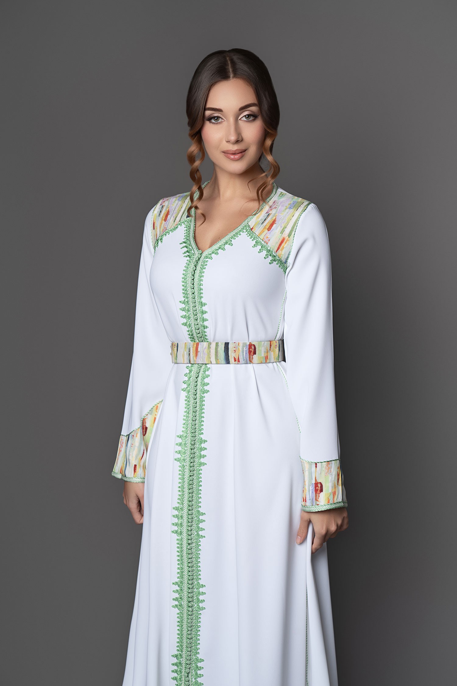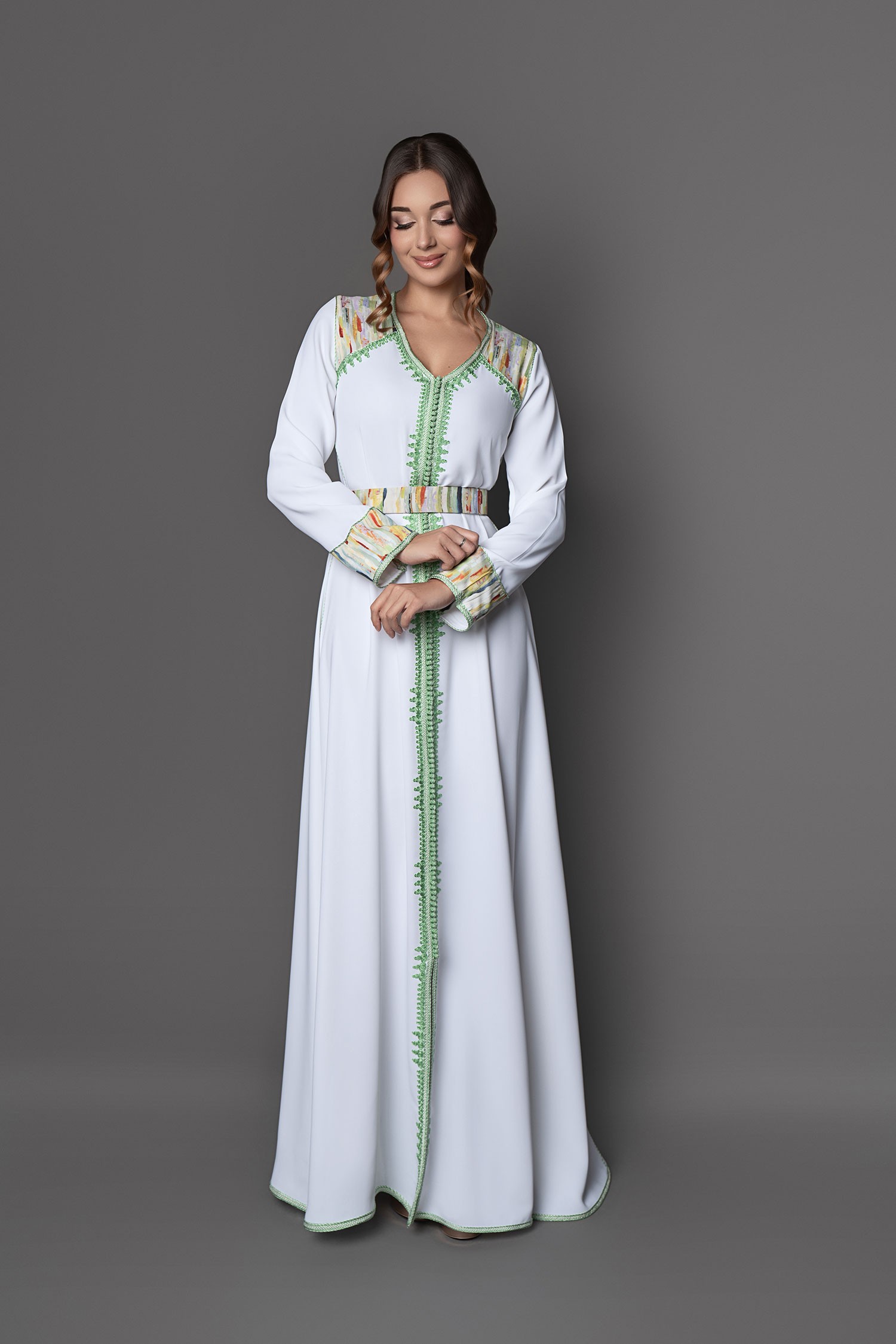 Le caftan Pipa est une magnifique pièce en crêpe blanc fluide, qui se distingue par ses touches de couleurs créées par des découpes aux épaules et aux manches. Ce style de découpe apporte une touche d'élégance et d'originalité à ce caftan. Le caftan est orné d'une broderie aux 4 fils vert, qui ajoute une touche de sophistication et de raffinement à l'ensemble. Pour mettre en valeur la silhouette, le caftan Pipa est accompagné d'une ceinture coordonnée. pour créer une jolie courbe et souligner la féminité de la tenue.