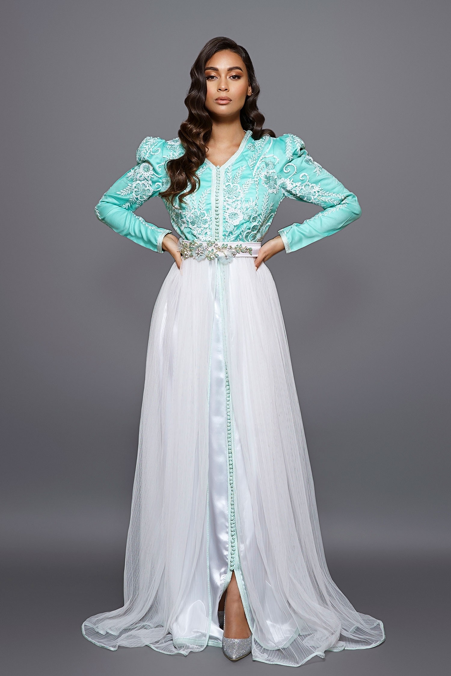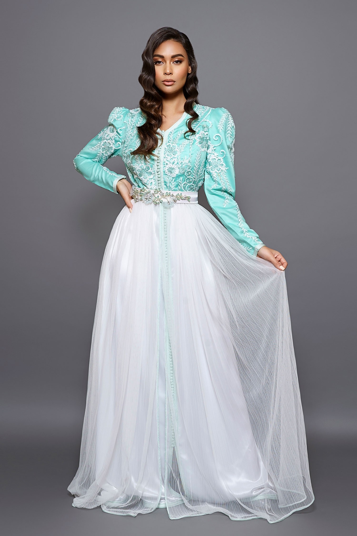 Caftano in raso di seta bianco. Top in pizzo verde pallido con manica gigo, scollo a V. Gonna in tulle plissettato bianco. Cintura coordinata con spille.