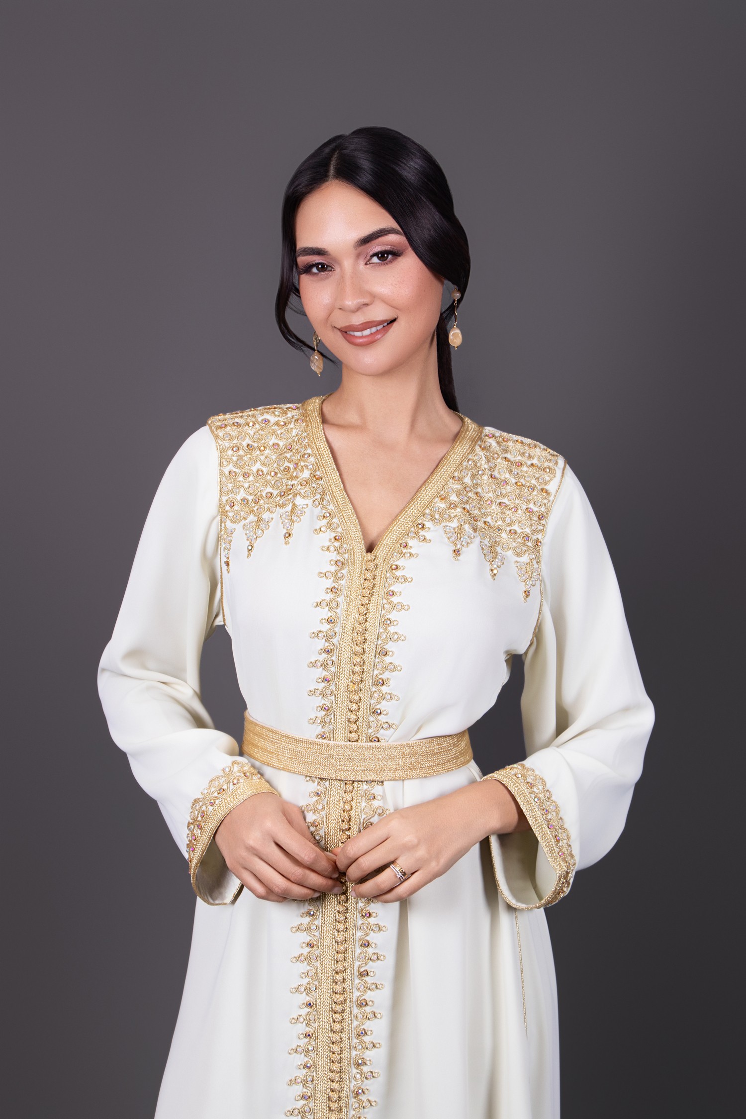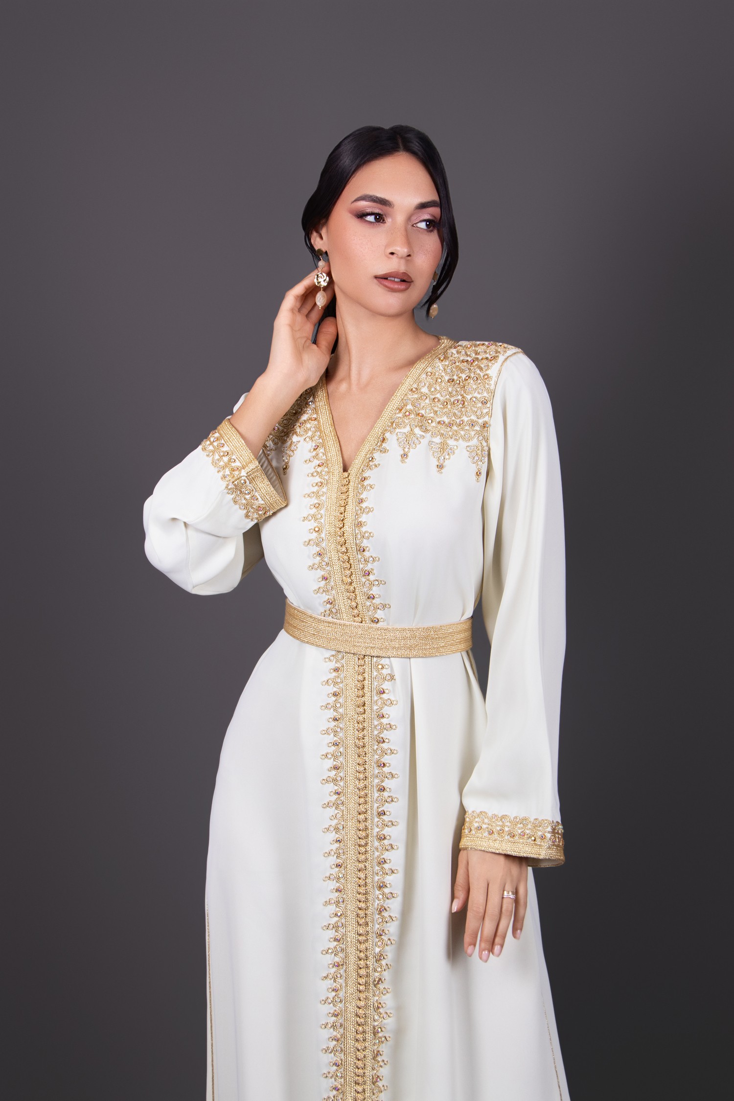 Deze elegante eenstuk-kaftan is ontworpen in een weelderige vanille-crèmekleur, versierd met luxe gouden borduursels en subtiele pareldetails. De vloeiende en majestueuze snit wordt versterkt door een bijpassende riem die het silhouet accentueert. Perfect voor speciale gelegenheden, het combineert Marokkaanse traditie met moderne verfijning.